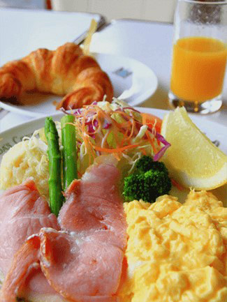「京の朝食」は、こだわりのボンレスハムとふんわりとしたスクランブルエッグ、サラダとクロワッサン、フルーツジュースとコーヒーのセットです。おいしさに満たされて、さぁ、京都観光に出かけましょう。「ウインナーセット」もおすすめです。