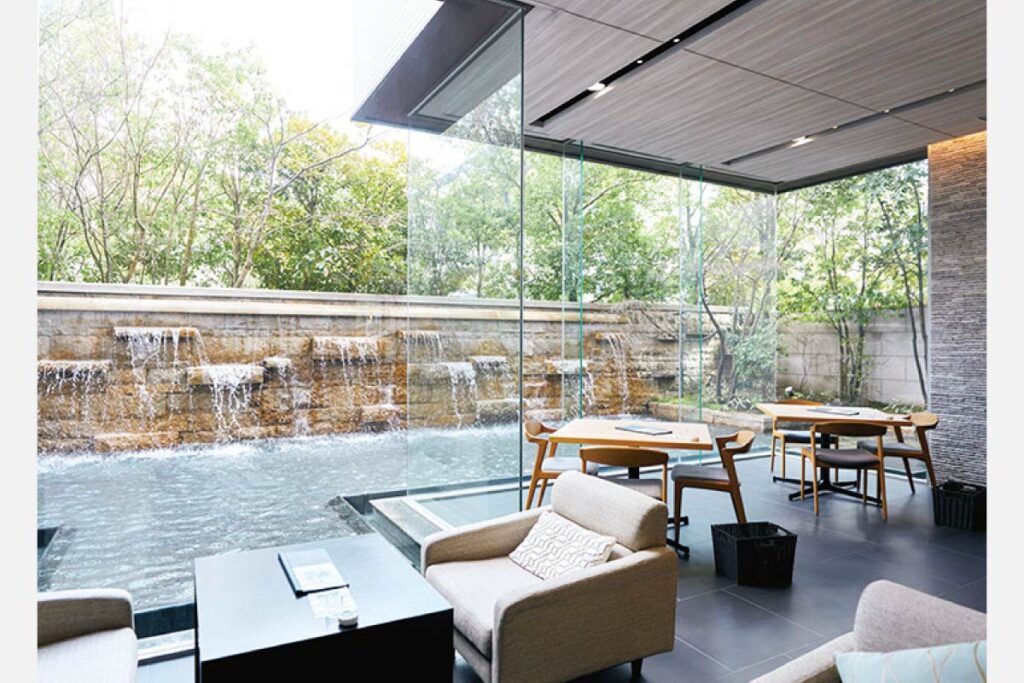 ホテルロビーのように洗練された水庭に臨む空間で、産地に思いを馳せながら、繊細な茶の違いを実感して。