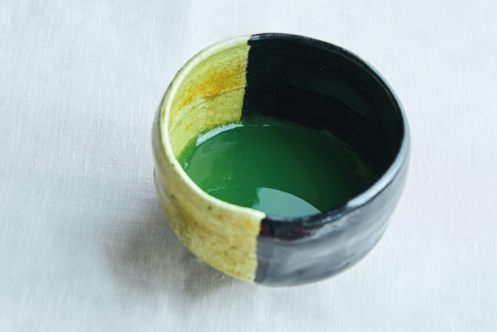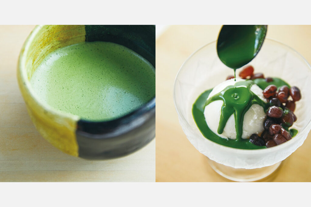 京都「丸久小山園」の高級抹茶を、まずは濃茶で2~3口楽しもう。残り半分はアイスに掛けてアフォガード(写真右)に。残りは湯を足し、薄茶(写真左)で余すことなく堪能できる。