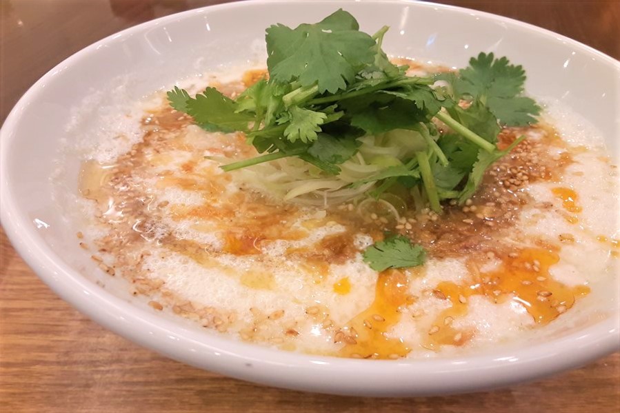 麺類やご飯類も多くある「春水堂(チュンスイタン)グランフロント大阪店」ですが、一番人気は「豆漿鶏湯麺(トウジャンジータンメン)」950円。豆漿とは、台湾の朝食でよく食べられる豆乳のこと。台湾の豆乳は日本の豆乳と違って、軽く飲みやすいことが特長。台湾では、この豆漿に干しエビや黒酢にネギなどの薬味類を入れた鹹豆漿(シェントウジャン)が朝食としてポピュラーなんです。