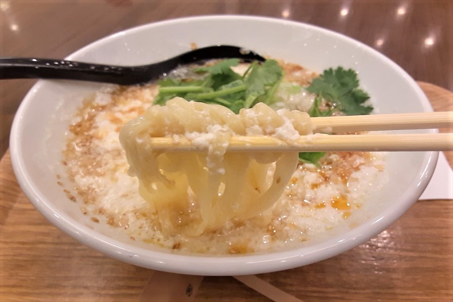鹹豆漿(シェントウジャン)に、あっさりした鶏ガラスープを合わせてもちもちの麺を入れたのが「豆漿鶏湯麺(トウジャンジータンメン)」。鹹豆漿(シェントウジャン)は、黒酢が入っているので豆乳が所々固まっておぼろ豆腐のようになって、蒸した鶏肉をゴマダレであえたものもジューシー!上には、パクチーもあってその香りもアクセントに。スープがおいしくて、ずっと飲んでしまう一品です。