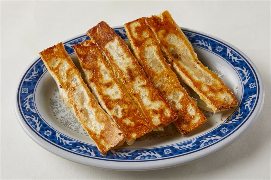 「台北餃子 張記(たいぺいぎょうざ ちょうき)茶屋町店」でいただきたいのは、やっぱり餃子。なかでも一押しは看板商品の「張さんの鍋貼(ゴーティエ) 焼棒餃子」5個319円(鍋貼<ゴーティエ>とは、焼き餃子の意味)です。