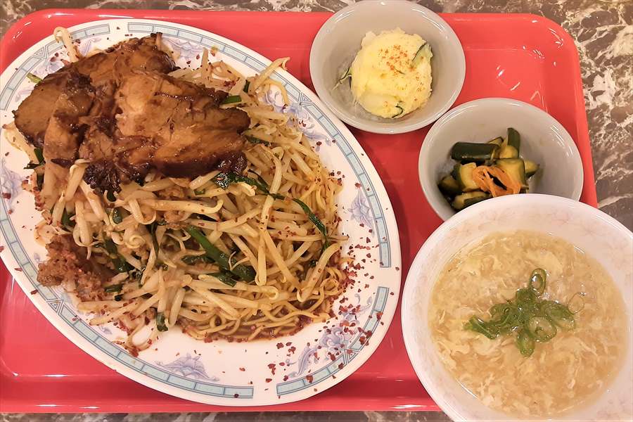 また、一風変わったメニューが「皿台北定食」979円。台湾チャーシューまぜ焼きそばと銘打っているのですが、焼きそばとはまた少し違うオリジナルメニュー。自家製秘伝の醤油ダレでトロトロに煮込んだ分厚いチャーシュー、シャキシャキのもやしと青ニラ、そしてパンチのあるニンニクと唐辛子やスパイス類たっぷりのソースが夏の暑さを吹き飛ばしてくれそうな焼きそばです。途中で酢を加えればまたさっぱり。元気になれる一品ですよ。