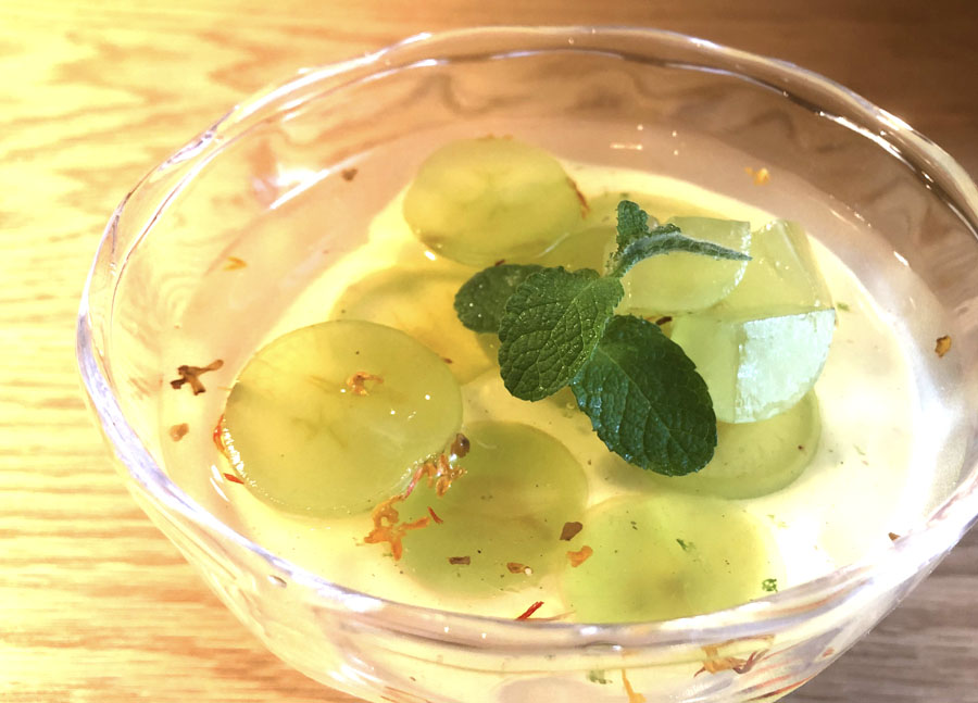 Café de assiette(カフェ ドゥ アシェット)では、季節のフルーツをたっぷり使ったデザートが楽しめます。写真は、「巨峰とピスタチオのパルフェ」です。