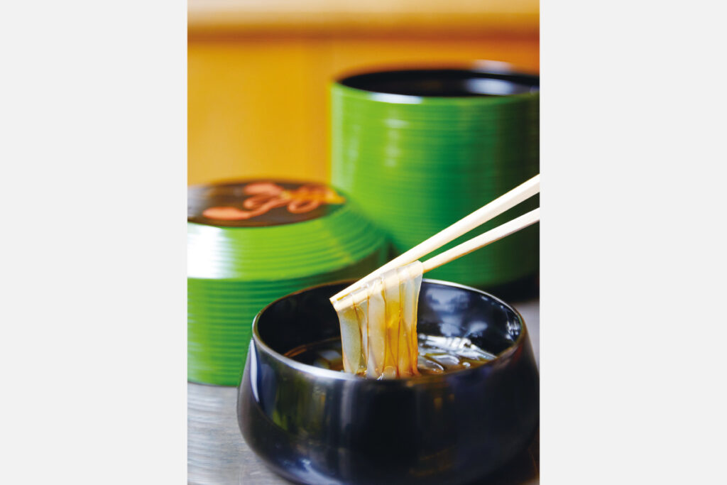 八坂神社への参拝客が帰りに立ち寄って食べていくことも多いという「くずきり」に使うのは、吉野本葛と水のみ。注文後に葛を水で溶くところから作りはじめ、できたてをすぐに提供している。波照間島産の黒糖蜜または白蜜をかけて、「くずきり」のつるんとした喉ごしや、弾力のある歯ごたえを楽しもう。