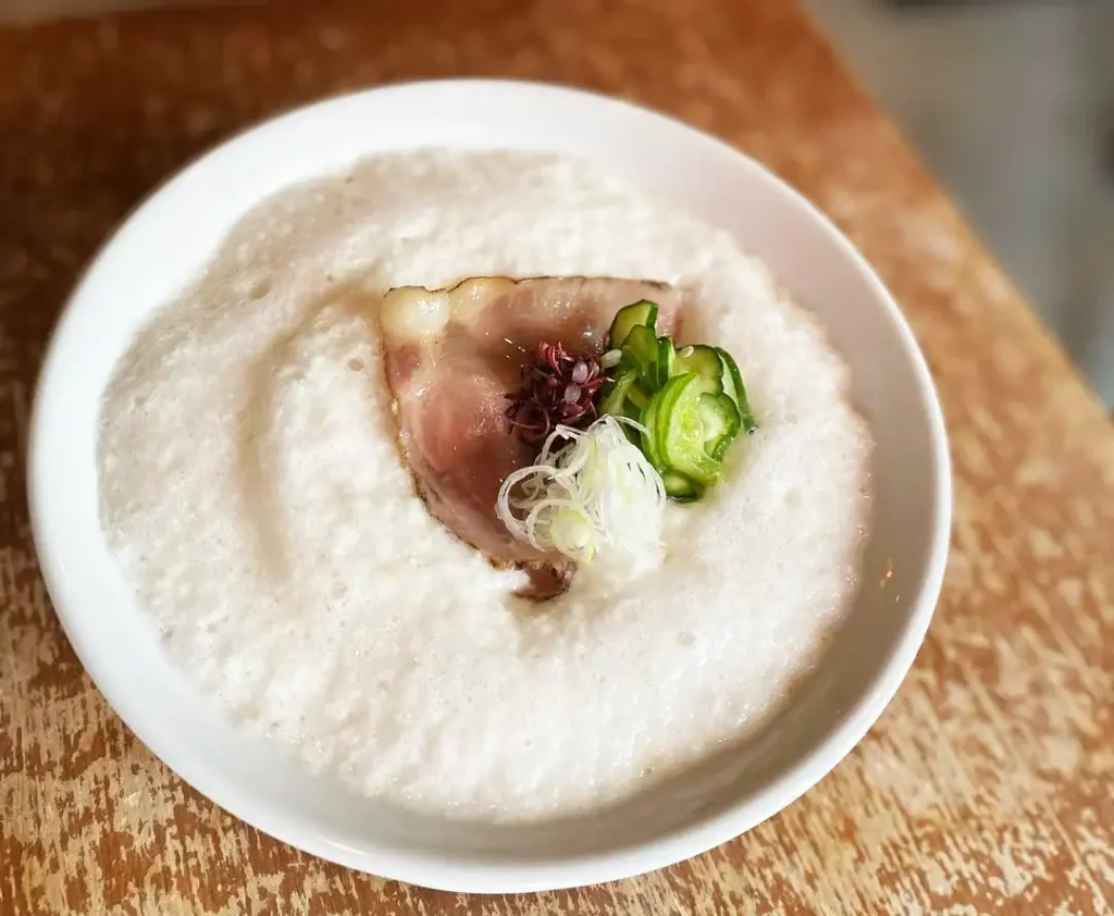 「鳴尾山芋研究所 フラットブッシュ」 のとろろは重たそうに見えますが、まるでホイップのような泡状のきめ細やかさ! 山芋自体の味付けはほとんどされておらず、スープと合わせていただいて滋味深い味わいに仕上がっています。それゆえ、「鳴尾山芋研究所 フラットブッシュ」で推奨されているシメは「ごはん」!