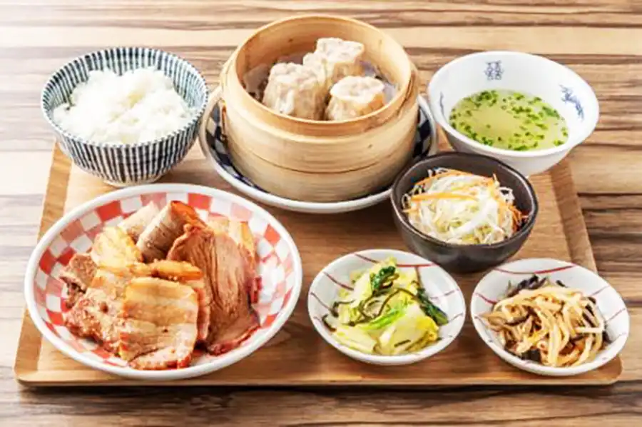 「シュウマイと焼豚 西宮ブルース」ランチのおすすめは、焼売と焼豚が両方味わえる「炭火ヤキブタと焼売定食」990円。スープに副菜などもあって、おいしさはもちろんボリュームも大満足のランチです。ランチは、ご飯のお代わりも無料とのことなので、たくさん食べたい人にもぴったりですよ!