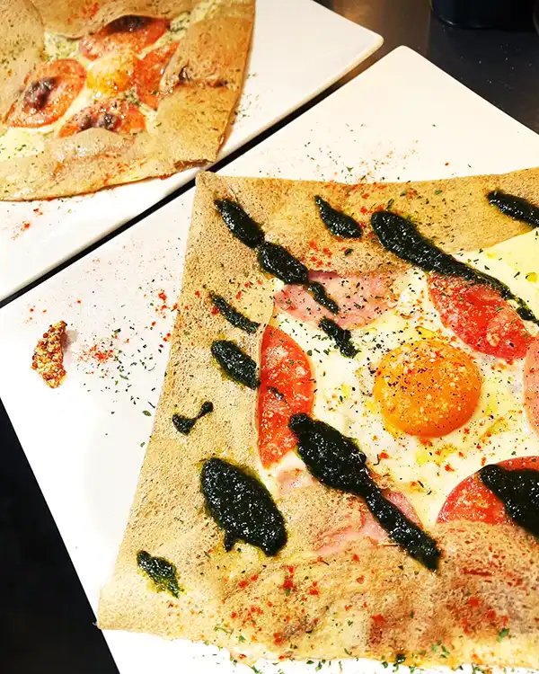 特に「LE66 PLATABLE(ル・ロクロクプラターブル)」の名物ガレット(クレープ)は、人気の蕎麦店「土山人」から仕入れるそば粉を使った一品。つなぎを使わずないガレットは、旬のそば粉、卵、水、塩だけで作られているため香り高く、外はカリっと、中はもっちりとした食感が魅力です。