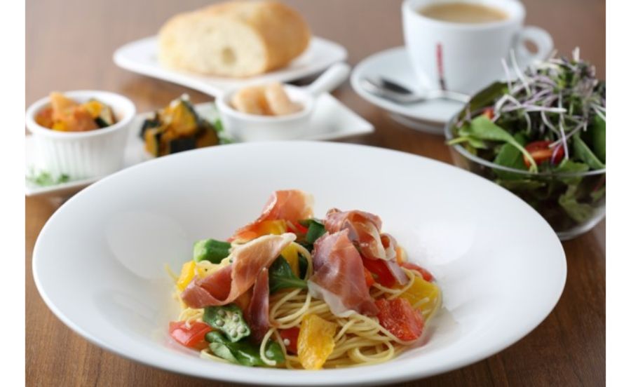 2種類からパスタを選べて、コスパが良いと評判のパスタランチは1,180円〜。写真のパスタは「生ハムのペペロンチーノ」(内容は季節によって変わります)。