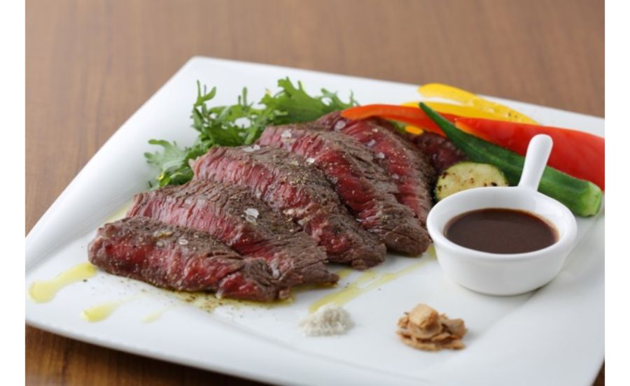おいしい赤身肉は、塩と赤ワインで作ったソースで「国産牛ランプステーキ 岩塩と赤ワインソース」。