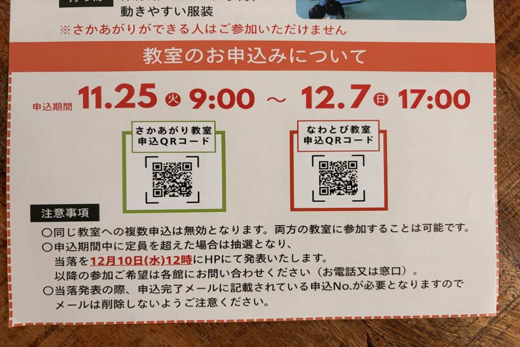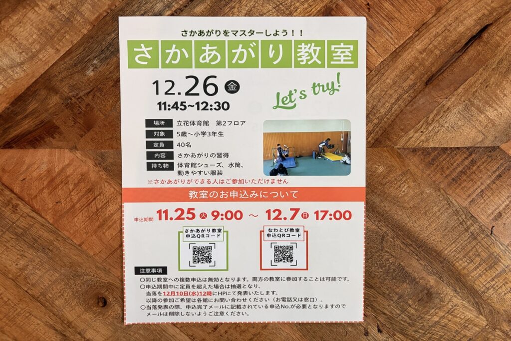 5歳から小学3年生までを対象にした「さかあがり教室」と「なわとび教室」が開催されます。冬休みに練習を重ねて、新年早々にマスターできるとうれしいですね!