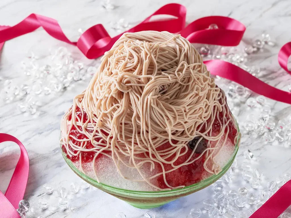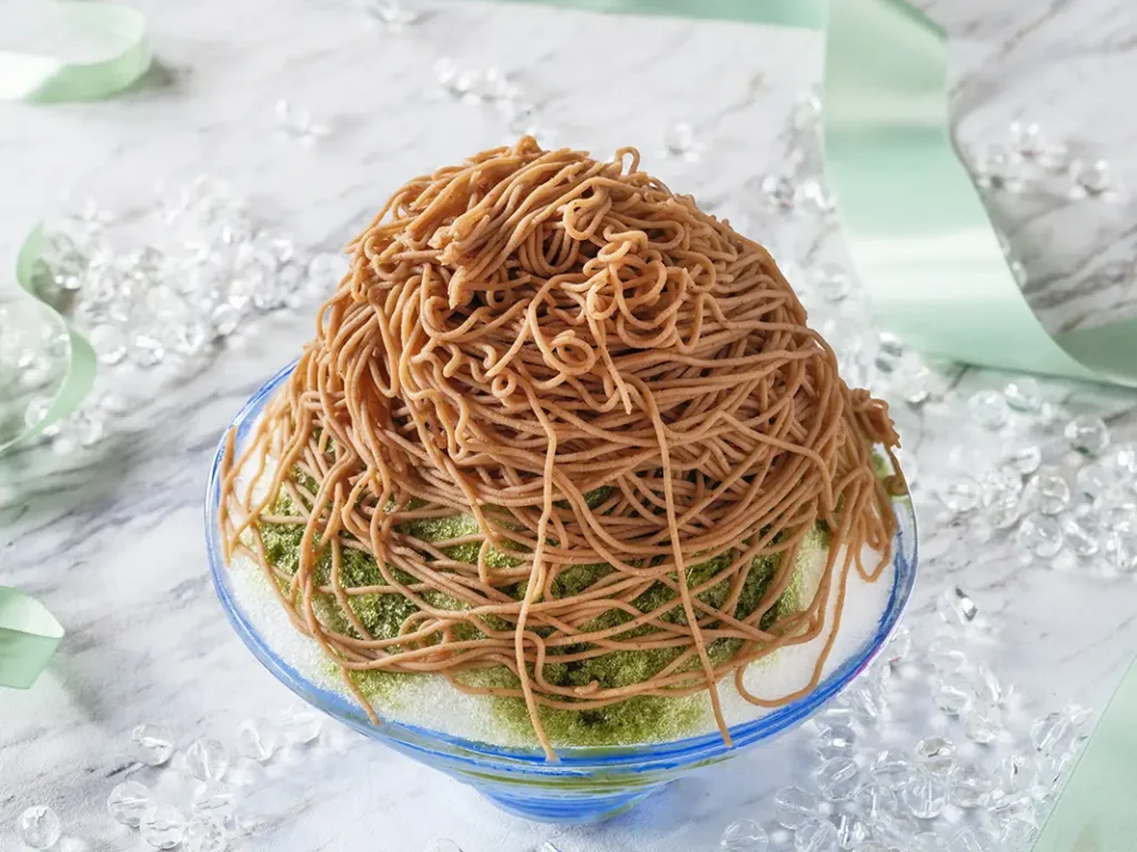 素材に食感、味わい深さやビジュアルにこだわったかき氷は、モンブラン風のクリームをあしらったいちごとマスカルポーネを使ったかき氷、あんみつのような味わいの抹茶と栗のかき氷など、パティシエが趣向を凝らし、それぞれ異なる味わいと彩りを楽しめるラインナップ。