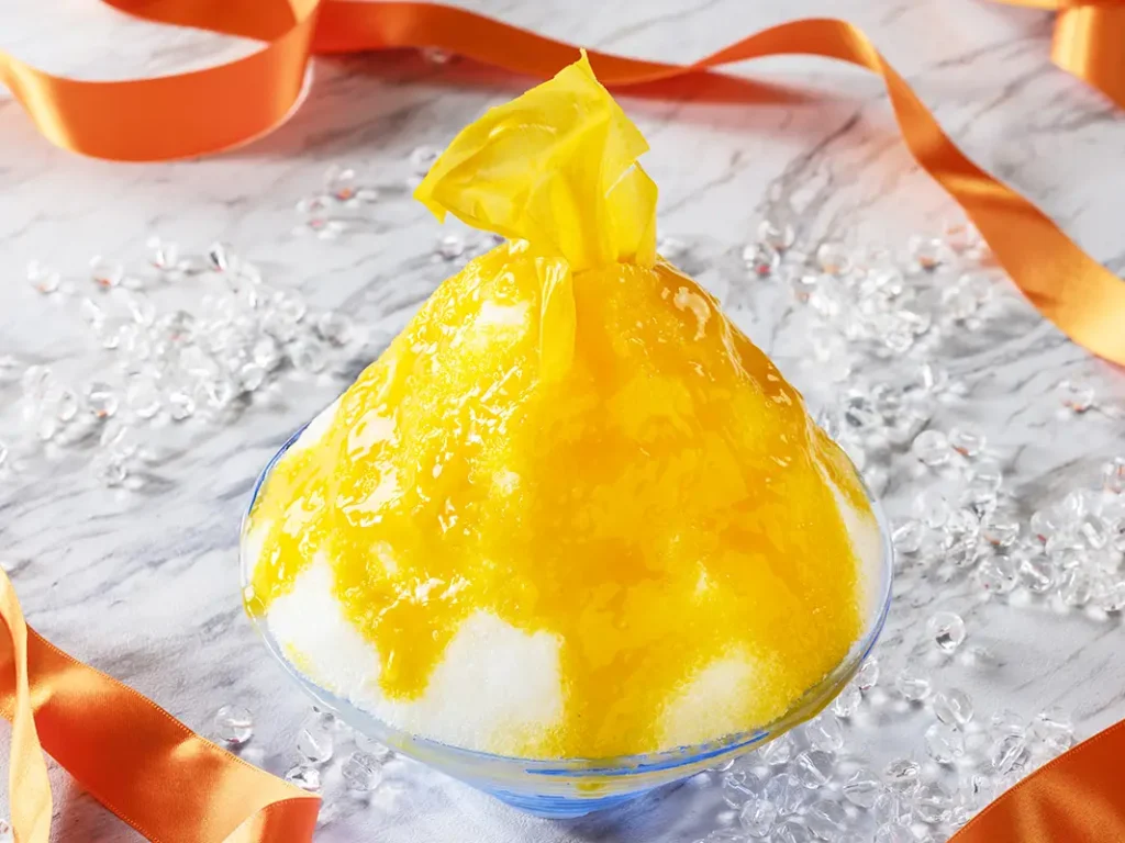 みずみずしいフレッシュマンゴーと杏仁豆腐を氷の中に、さらにマンゴーシロップと杏仁シロップで仕上げ。トッピングにはマンゴーチップを添えました。