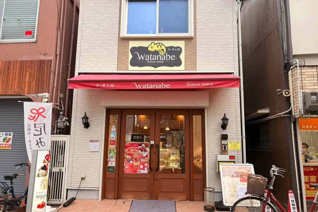 「ケーキ工房ワタナベ」があるのは、立花商店街を北に進み、途中で右手に曲がってすぐのところ。「コープこうべ コープ立花」の目の前で、赤いファサードが目印です。