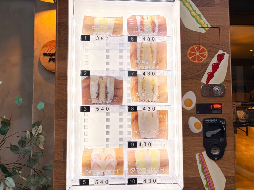 撮影時は苺のフルーツサンドやカスタード&ホイップなどのフルーツサンド、大山ロースハムレタスサンドやタマゴサンドなどがありました。筆者は早朝に外出するときに何度か利用しましたが、厚みのあるパンを使っているので食べ応えがあります。フルーツサンドの生クリームがたっぷりなのもポイント!このタイプのサンドイッチは店内では扱っていないので、24時間いつでも自動販売機で購入を。これからどんな種類が登場するのか楽しみです!