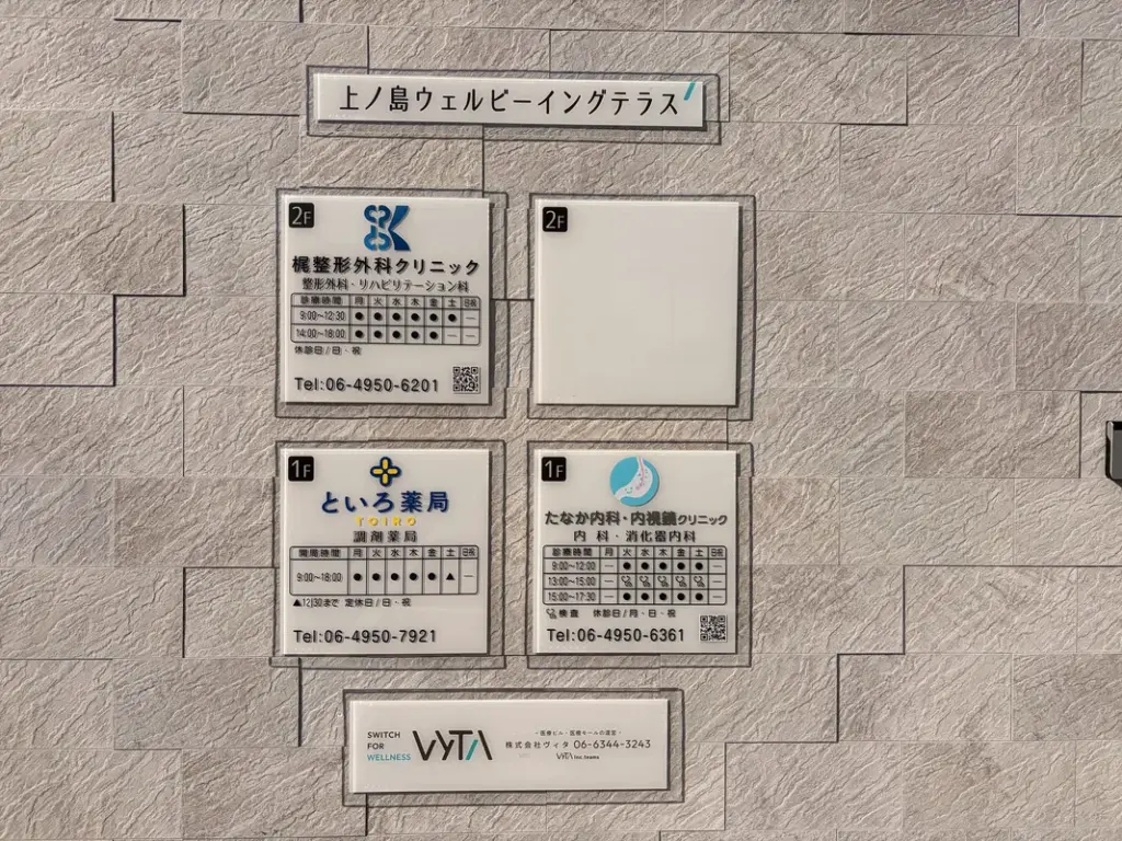 現在のテナントはこちら。1階には「たなか内科・内視鏡クリニック」と「といろ薬局」が入っています。「たなか内科・内視鏡クリニック」には、インフルエンザ予防接種1人2,700円、ペア割5,000円の貼り紙がありました。子ども(3歳以上)は1回目3,000円、2回目2,000円のようです。