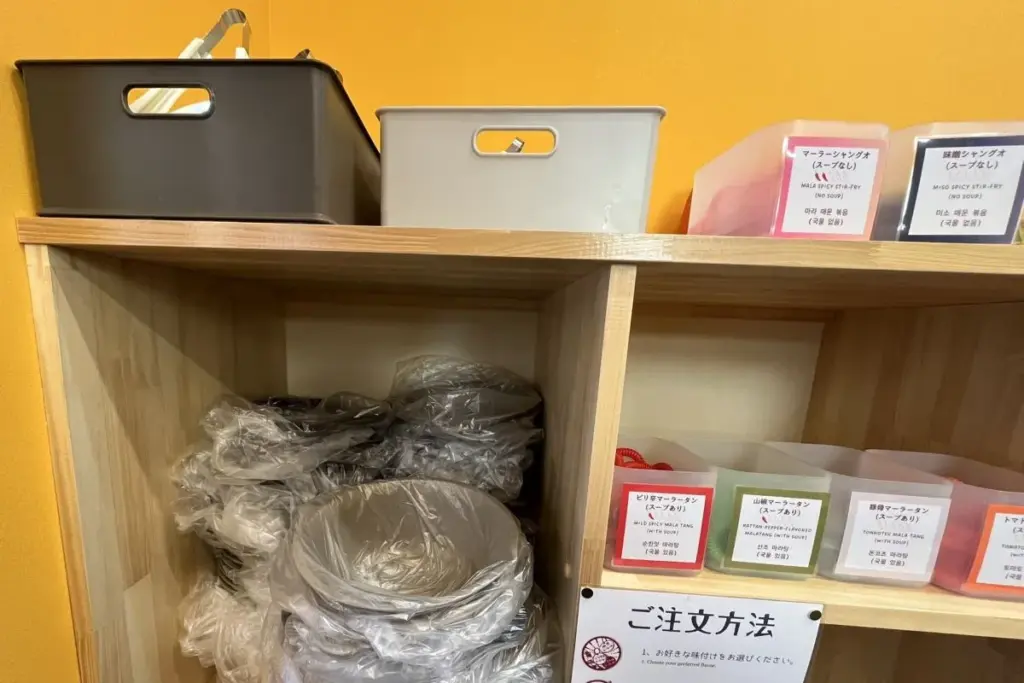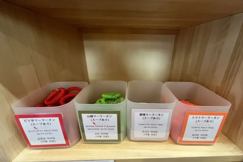 まずはスープを選びます。汁ありのマーラータンは、ピリ辛・豚骨・トマト・山椒の4種。汁なしのマーラーシャングオは、マーラー・味噌の2種です。豚骨やトマトは辛味がないので、辛さが苦手な人も安心。スープの種類を示すラバーバンドを手にはめたらトングとボウルに好きな具材をいれていきます。