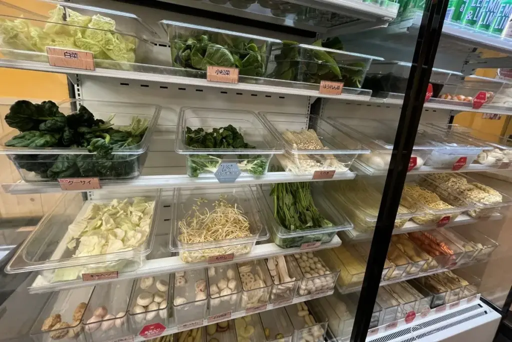 店内の食材コーナーから野菜、肉類、春雨や麺など60種類以上の具材をボウルとトングで選び、量り売り方式(100gあたり約400円)で注文します。
