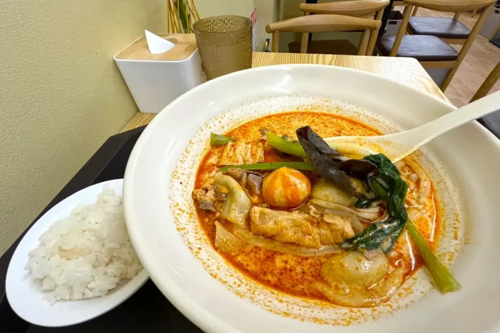 さあ!いよいよ実食♪スープは、辛すぎず旨味がたっぷり。しっかり煮込まれていて、自分で選んださまざまな具材を楽しめるので最後まで飽きません。スープをじっくり味わったら、ご飯をいれたり、タレで味変するのもオススメです。