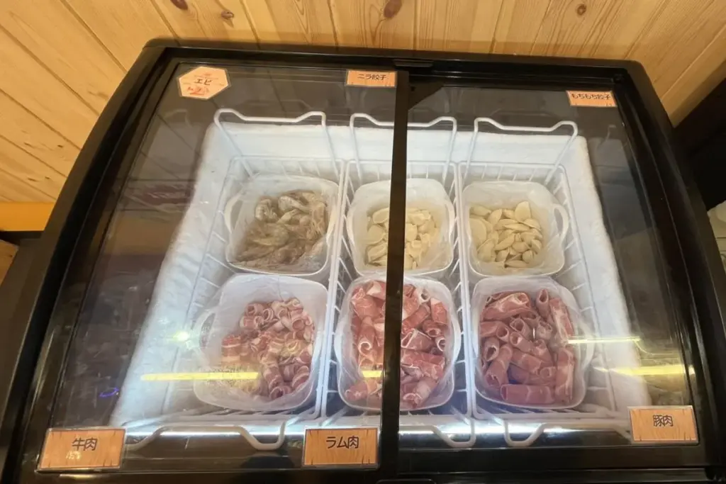 最初の冷凍コーナーには、牛肉、豚肉、ラム肉、エビ、ニラ餃子、もちもち餃子がありました。スープに旨味をプラスしてくれる具材ばかり。