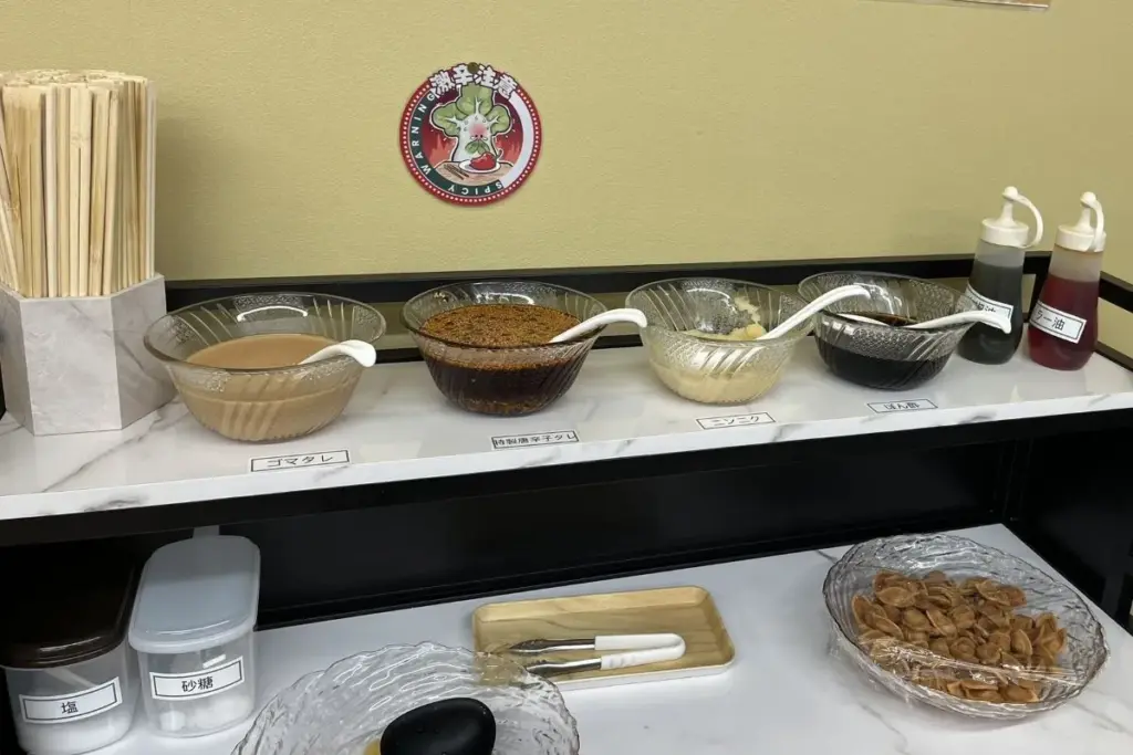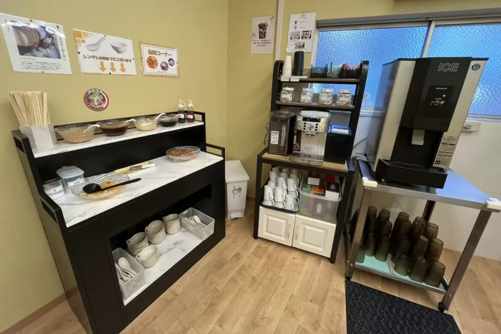 料理ができるまではセルフサービスコーナーで、タレを準備して待ちましょう。胡麻ダレ、特製唐辛子タレ、ニンニク、ぽん酢などがセットされています。番号が呼ばれたら、受け取り口に取りにいきます。その時に無料のごはんの有無を尋ねられるので、サイズを伝えます。おかわり無料もうれしいポイント。