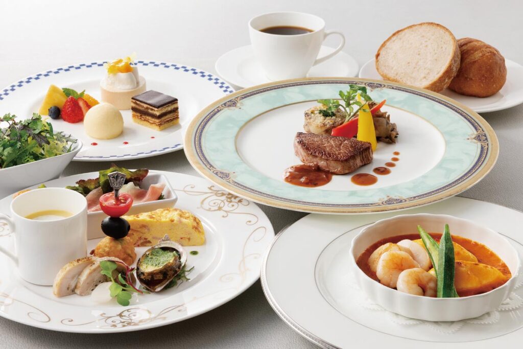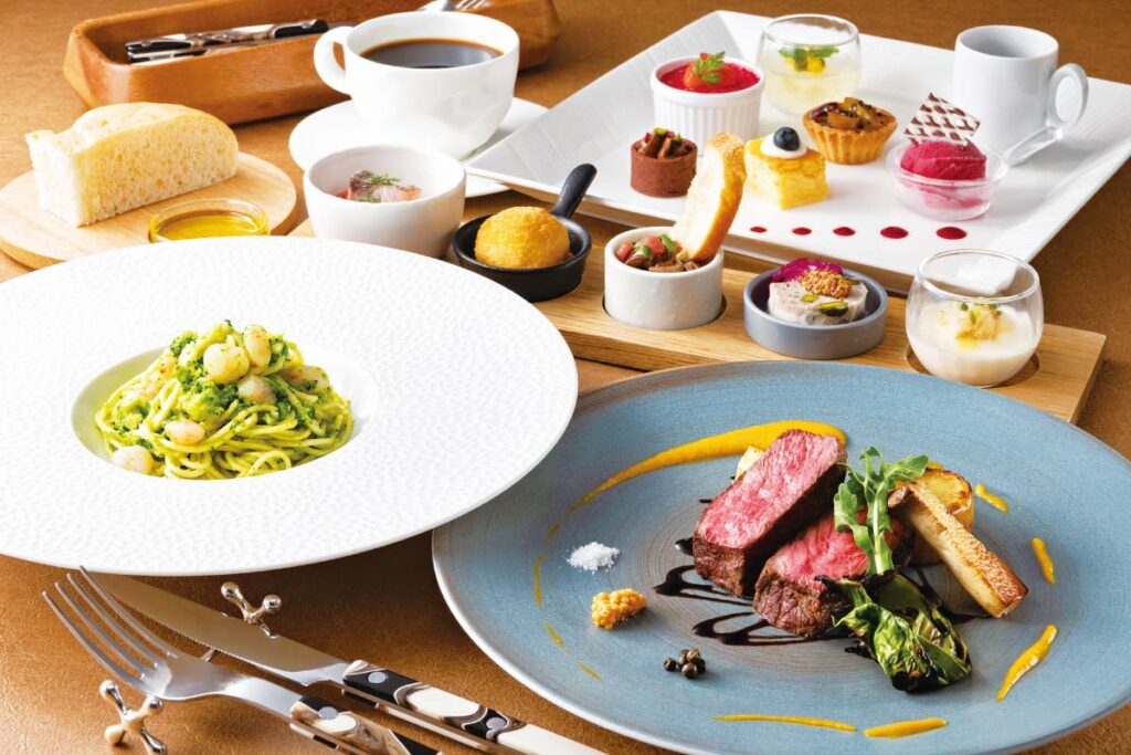 蝦夷鮑(えぞあわび)を含む5種類の前菜、旨味広がる魚料理、牛フィレ肉のポアレ、デザートの盛り合わせなど、彩り豊かなランチコース。25階から大都会の景色を眺めながら料理を堪能すれば、優雅なひと時になること間違いなし。