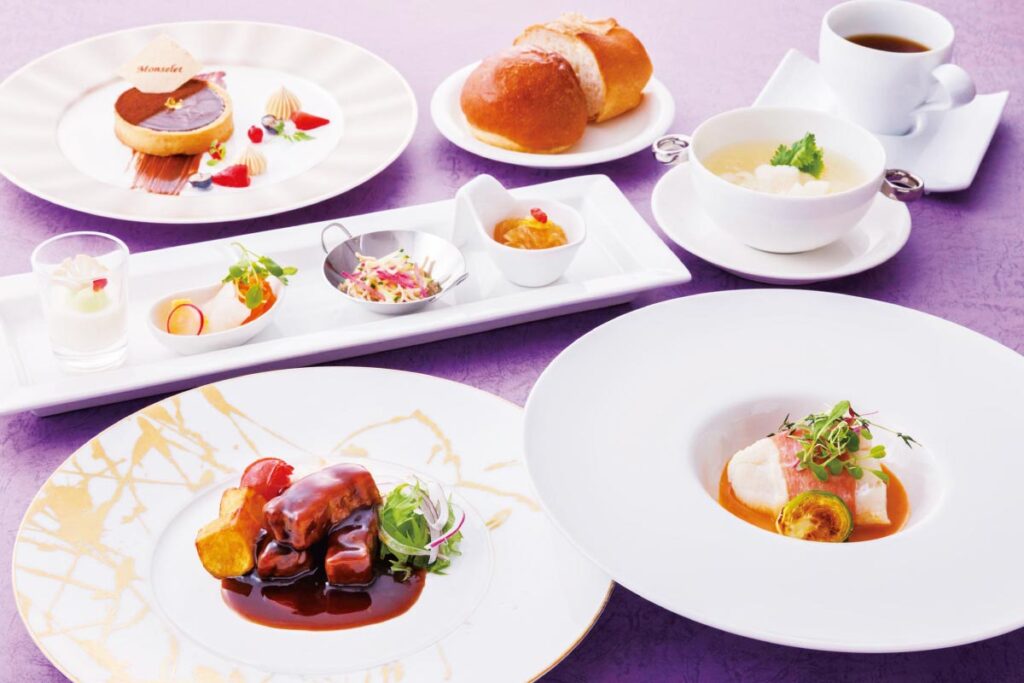 鱈と鴨肉の前菜、金目鯛と有頭海老のひと皿、濃厚なソースで味わう牛フィレ肉、甘さとほろ苦さがマッチしたデザートなどが楽しめるコース。宝塚大劇場に隣接するホテルの光あふれる店内で、彩り豊かなお料理とともに、大切な人と特別な時間を過ごして。