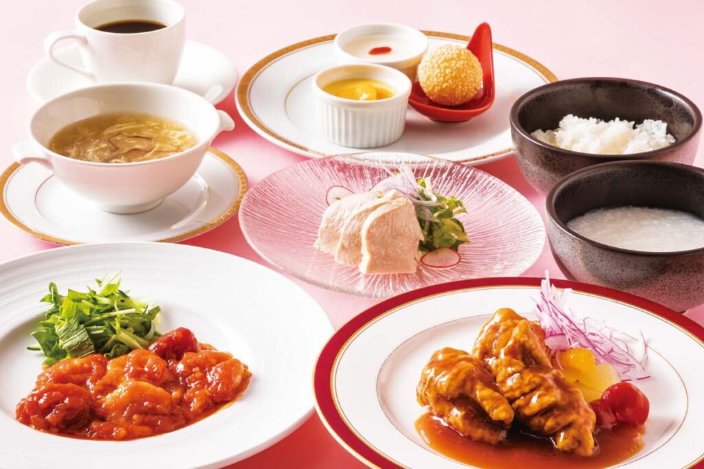 新前菜にスープ、デザートまで全6品のお得なランチ。メイン料理は海老のチリソースや酢豚など、6品から好みの2品を選択可能。デザート3種と食後のコーヒーまで付くコースを心ゆくまで楽しんで。