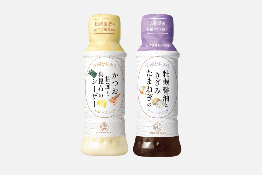季節を感じる旬の食材を楽しむ一皿を提案する「季の皿シリーズ」から人気の2本(かつお枯節と真昆布のシーザードレッシング、牡蠣醤油ときざみたまねぎのドレッシング)をセットでお届け。かけるだけでいつものサラダが贅沢(ぜいたく)な一品に。