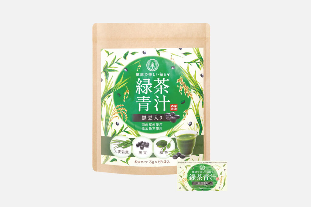 特別栽培茶使用の粉末緑茶に、クセの少ない大麦若葉と香ばしい黒豆をブレンドしたまろやかな青汁。食品添加物不使用で、牛乳やヨーグルトに混ぜるのもおすすめ!