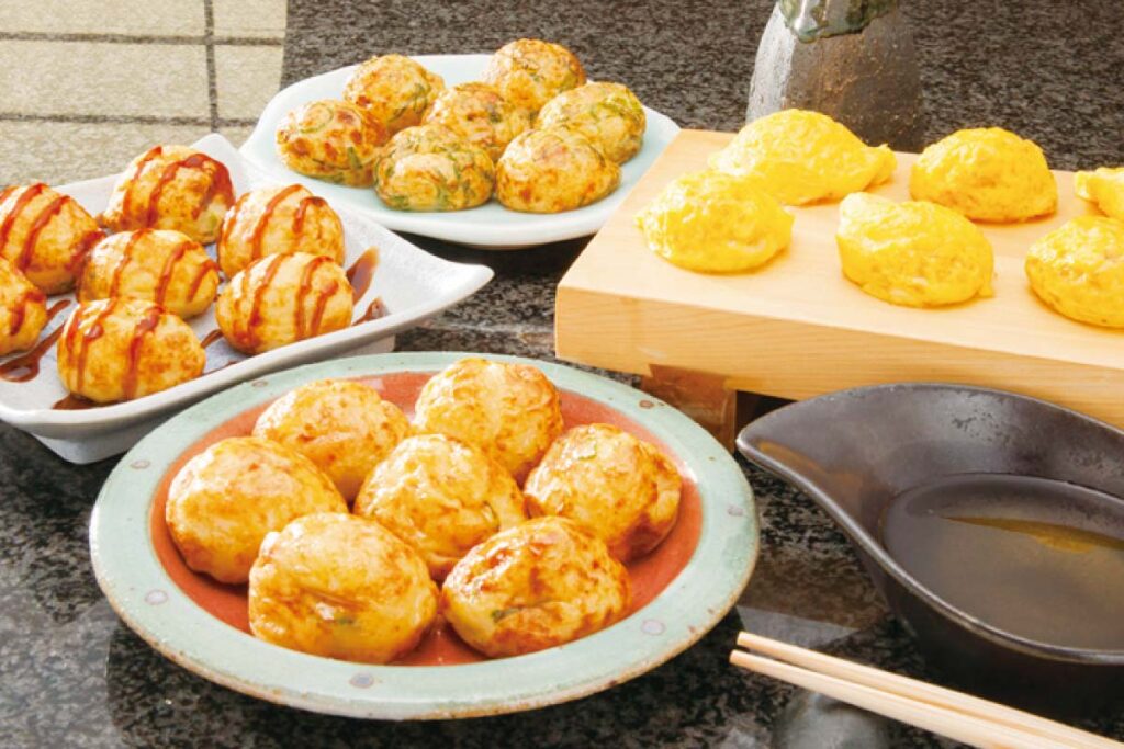 詰め合わせ内容:しょう油味たこ焼7個×2 、明石焼6個×2、ねぎたこ焼7個、博多明太子たこ焼7個、 こんにゃくたこ焼7個、お好み焼1枚