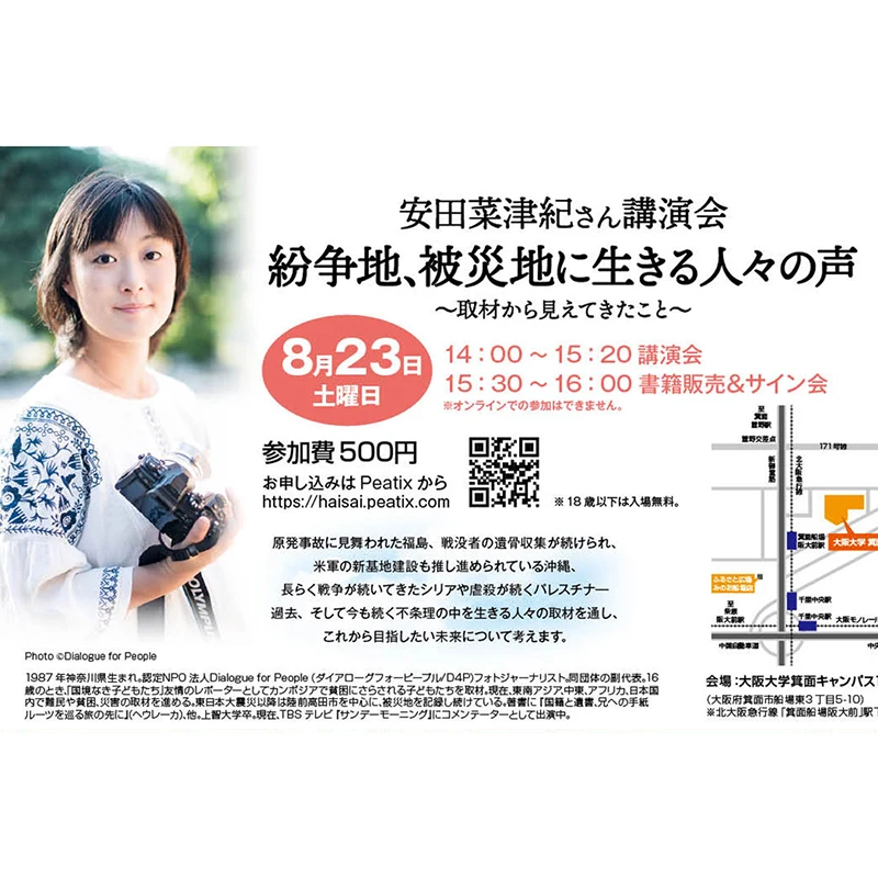 23日の講演会の登壇者は、フォトジャーナリストの安田菜津紀氏。原発事故に見舞われた福島、戦没者の遺骨収集が続けられ米軍の新基地建設も推し進められている沖縄、長らく戦争が続いてきたシリアや虐殺が続くパレスチナ……過去、そして今も続く不条理の中を生きる人々の取材を通し、これから目指したい未来について考えます。