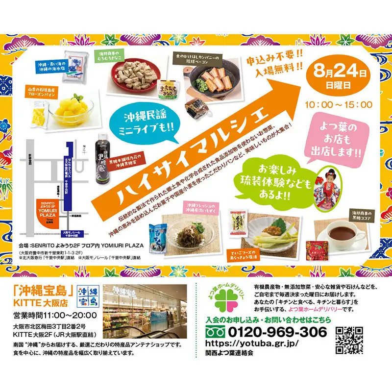 24日は「ハイサイマルシェ」が開催。伝統的な製法で作られた郷土食や化学合成された食品添加物を使わない総菜、沖縄の恵みを詰め込んだお菓子や国産小麦を使ったこだわりパンなど、沖縄のおいしいものが一堂に会します。沖縄民謡のミニライブもあります。