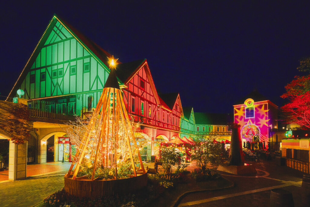 標高約400mの山上に広がる日本最大級のハーブ園は、森の木や葉など自然素材を生かしたタワーやリースで、ボタニカルなクリスマス空間に。ドイツの世界遺産「ヴァルトブルク城」をモチーフにした重厚な雰囲気の展望レストハウスや城門に囲まれた広場で開かれるのが、「神戸クリスマスマーケット」。