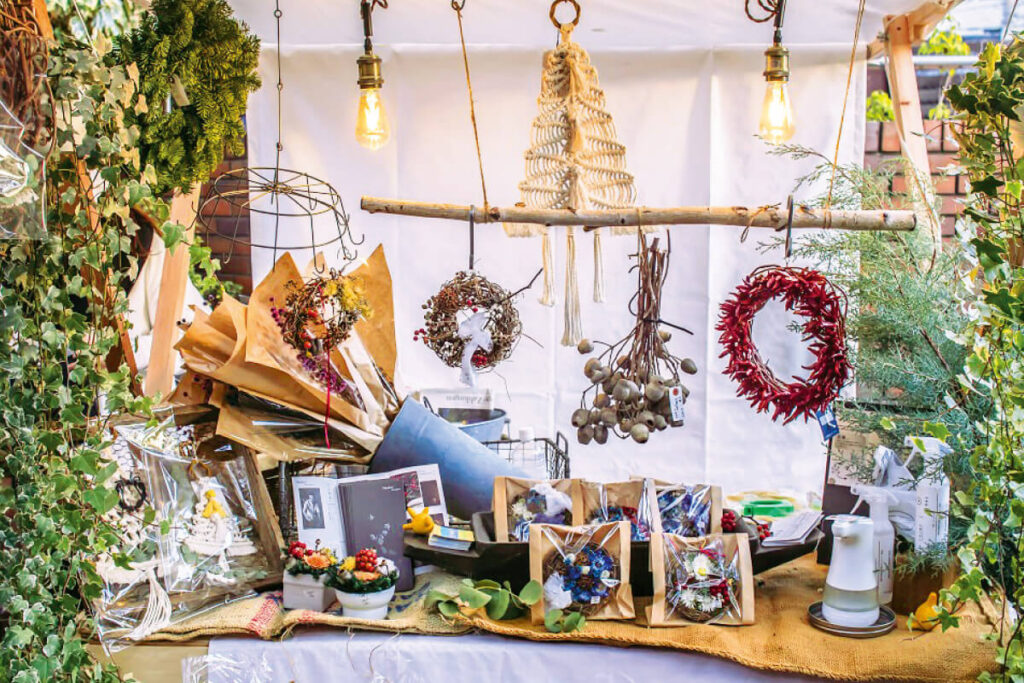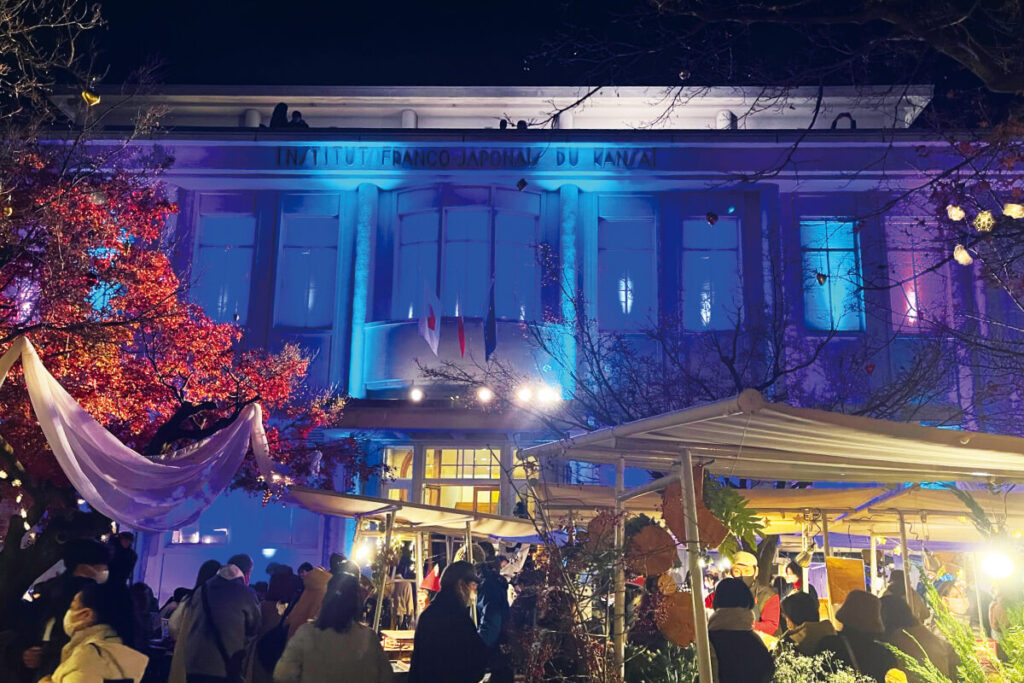 京都大学のそばに建つ洋館が、フランス語の普及と日仏文化交流を目的に活動するフランス政府公式機関・関西日仏学館。コンクリートの父と呼ばれるフランスの建築家・ペレの弟子、メストラレが基本設計した、国登録有形文化財の優美な建物だ。ガーデンで毎月開くマルシェは、年一度クリスマスバージョンに。通常より多い約50店が集まり、フランス人オーナーの出店もあるため、本場のパンやお菓子、雑貨と出合うことも。