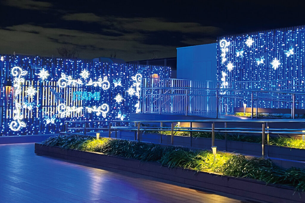 2020年、約50年ぶりの改修で搭乗者以外もさらに楽しめる場所へ生まれ変わったターミナルビル。夜になるとライティングされる4階展望デッキは、冬には光の装飾で一層きらびやかに。今年は「何色にも染まる希望の心」をイメージした“Pure White”をキーカラーに、カラフルに変化するLEDで多様な希望を表現。飛行機が離着陸する光あふれる滑走路も眺めつつ、冬の夜の空港を満喫して。