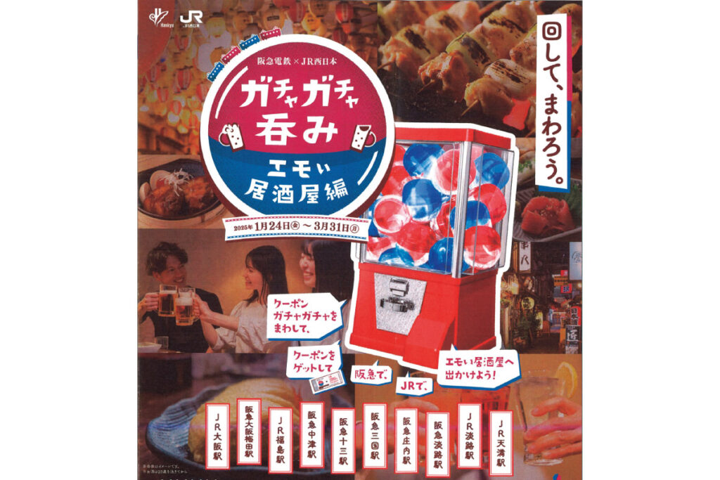 阪急電鉄とJR西日本の駅に設置のクーポンガチャガチャを回してクーポンを手に入れよう。お得なクーポンを手に、個性豊かな居酒屋巡りを楽しんで。