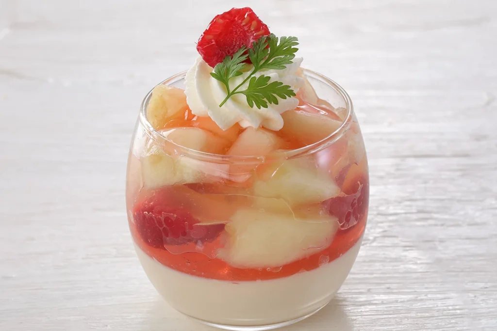 紅茶のパンナコッタに桃のコンポートとレモンのジュレを重ねた清涼感あふれるグラスデザートです。