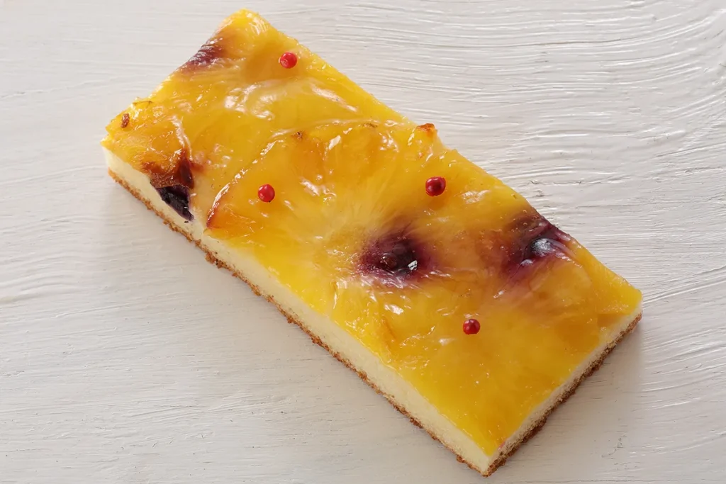 薄く伸ばしたブリオッシュ生地にチーズクリームが塗られ、パイナップルやブルーベリーがトッピング。