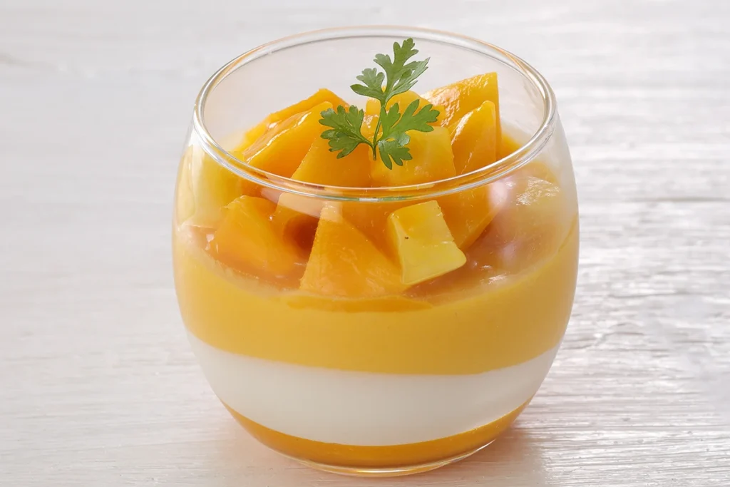 マンゴーの濃厚な甘みとココナッツの甘い香りにパッションフルーツのさわやかな酸味が加わった、トロピカルな味わいのグラスデザート。