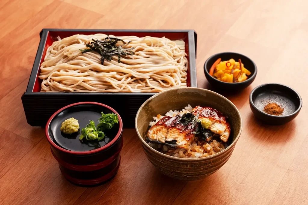「宮本むなし」では、大振り肉厚で香ばしく焼き上げふっくらと仕上げたうなぎが使用され、特に、刻み海苔・わさび・山椒などの薬味と一緒にひつまぶし風にお楽しみいただく「うなぎご飯とざるそばセット」が大人気です。