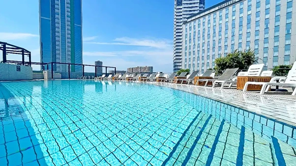 大阪湾に沈む夕景や、きらめく市街地の夜景を望む「グランドプリンスホテル大阪ベイ」。9階屋上のルーフトップガーデンプールは毎夏の風物詩で、令和7(2025)年も9月23日(火)までオープンしています。