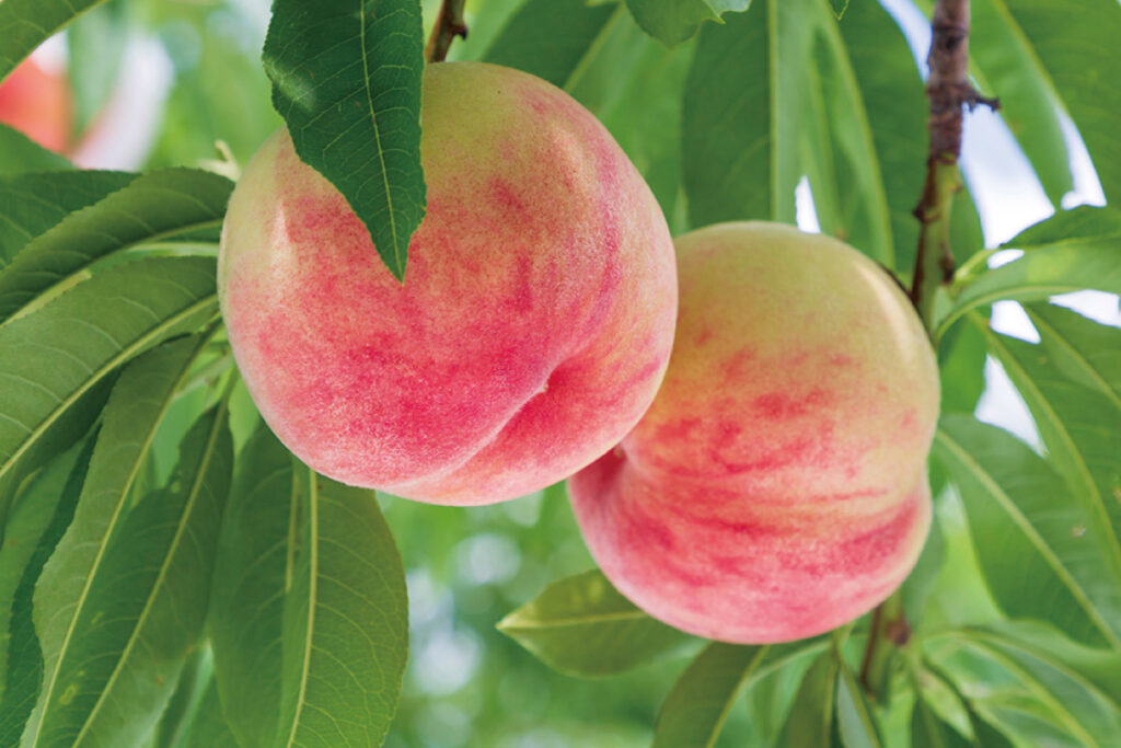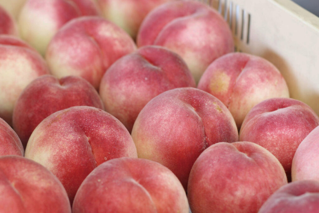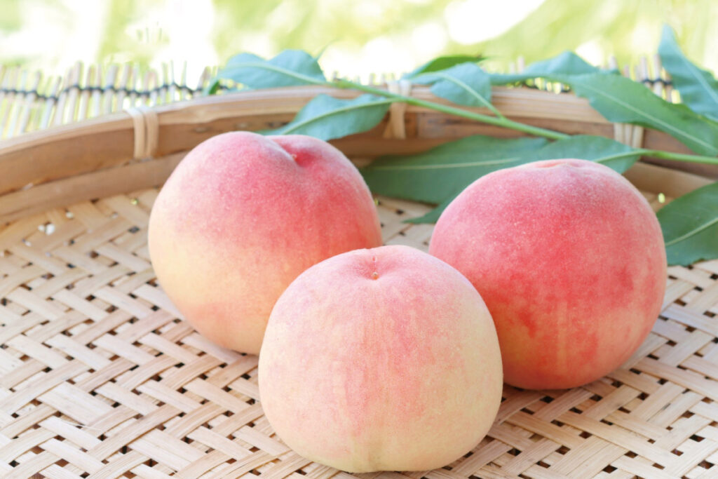 日本には40~50種あると言われます。大きく分けると皮をむいた時の果肉の部分が、白、黄、赤の3色に分かれます。白桃の代表的なものとしては、岡山で生まれた高級品種・清水白桃などが知られ、強い甘みと香りが特徴です。山梨県などで有名な白鳳は柔らかく、ジューシーな果肉が特徴。長野県などで育てられる黄金桃は黄色の果肉で、マンゴーのような香りの高さが特徴となっています。赤い桃には、果肉と皮が赤いもの、皮だけ赤いものの2タイプがあります。