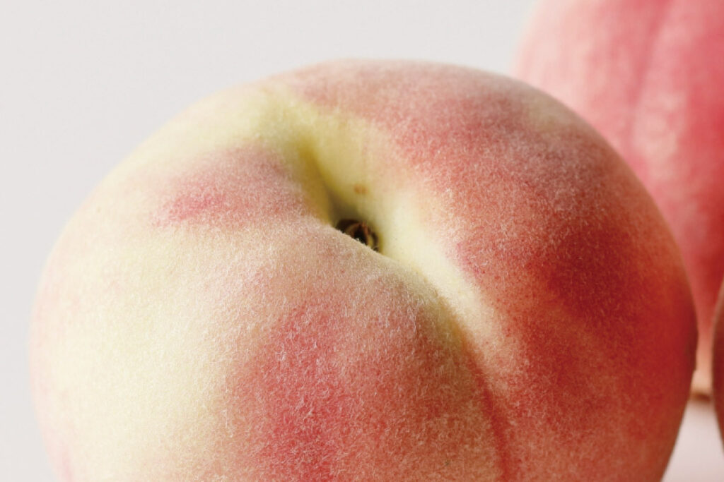 桃の最盛期は7〜8月で、早めに出てくる桃は柔らかくて、水分をたっぷり含んだジューシーなものが多く、皮をむく際に手でも簡単にスッと取れるくらい薄皮のものが多いですね。時期の後半になるほど少し硬めで甘みの強い桃になっていき、皮にも厚みが出て包丁を使って取り去るようになっていきます。また、食べごろを見分けるには、ヘタの周辺を確認します。購入時にはヘタの周辺に青みが残っているものを選び、青みの部分が乳白色になってからいただくのがおすすめです。購入時にヘタの周りが乳白色になったものを選んだ場合はすぐに食べるようにするのが良いですね。