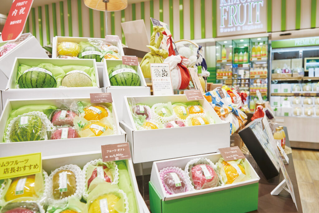 阪急うめだ本店内で、地下1階にジューススタンド、地下2階にギフトフルーツ、ケーキ、ジュースなどの加工品を扱う店舗を構えるキムラフルーツ。