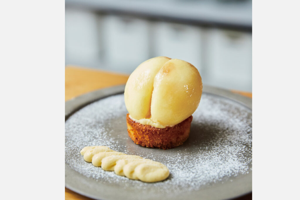 同店のフルーツパティシエ考案の桃スイーツは、コンポートした桃に、カスタードクリームを詰め、周りには桃ジュレが敷き詰められた「まるごと水蜜桃ジュレ」。コンポートの際に火は使用せず、桃の風味や食感をそのまま味わえるようにしている。周りに敷き詰められたゼリーとの食感の違いも楽しみたい一品。