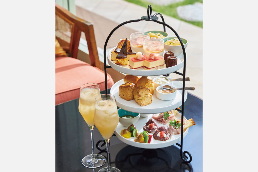 今夏のアフタヌーンティーは「ピーチ&バニラ」をテーマに、地元食材を中心に使用したフード4種、スコーン2種、デザート6種と全12種3段のプレートで提供。マレーシア発の紅茶ブランド「BOHティー」を13種、さらに昔ながらの製法で作っているジュースブランド「順造選」から白桃、黄金桃、すももをそろえる。深緑に包まれ、鳥のさえずりを聞きながら、至福のティータイムを過ごしたい。
