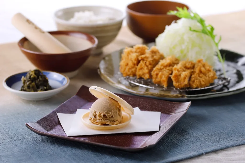 アイスは、京都のお茶の産地・和束町で作られる和紅茶「みおく」が使用され、自社のアイスクリーム工房で職人が手がけています。煎茶のように爽やかな香りとすっきりした味わいの和紅茶がしっかりと抽出されており、とんかつを食べた後にぴったりの味わいとなっています。