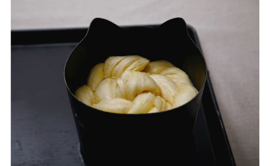 みつあみ状に織り込んだ生地を型に入れて焼くため、生地の水分が逃げず、しっとりとした食感に。