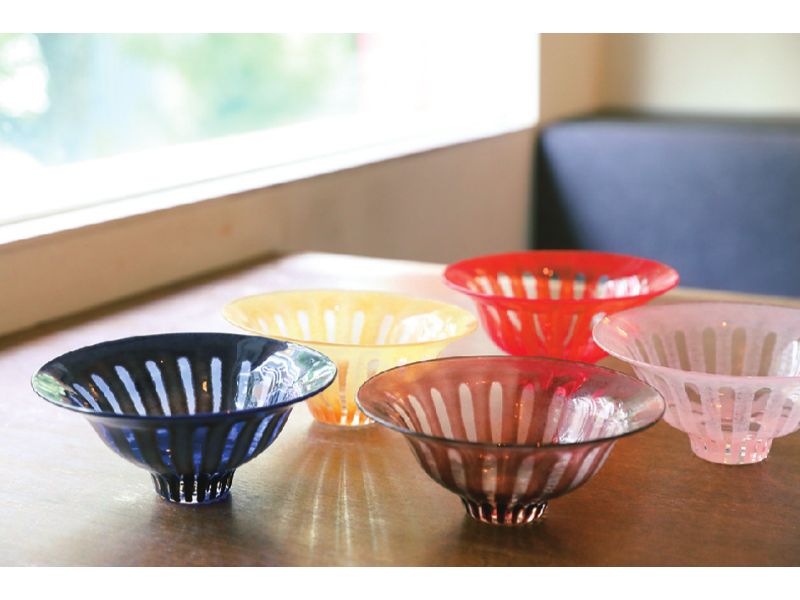 店主が惚れ込み、岡山県まで直接買い付けに行くというガラスの器は花岡 央さんの作。涼しげなスリット模様が粋。